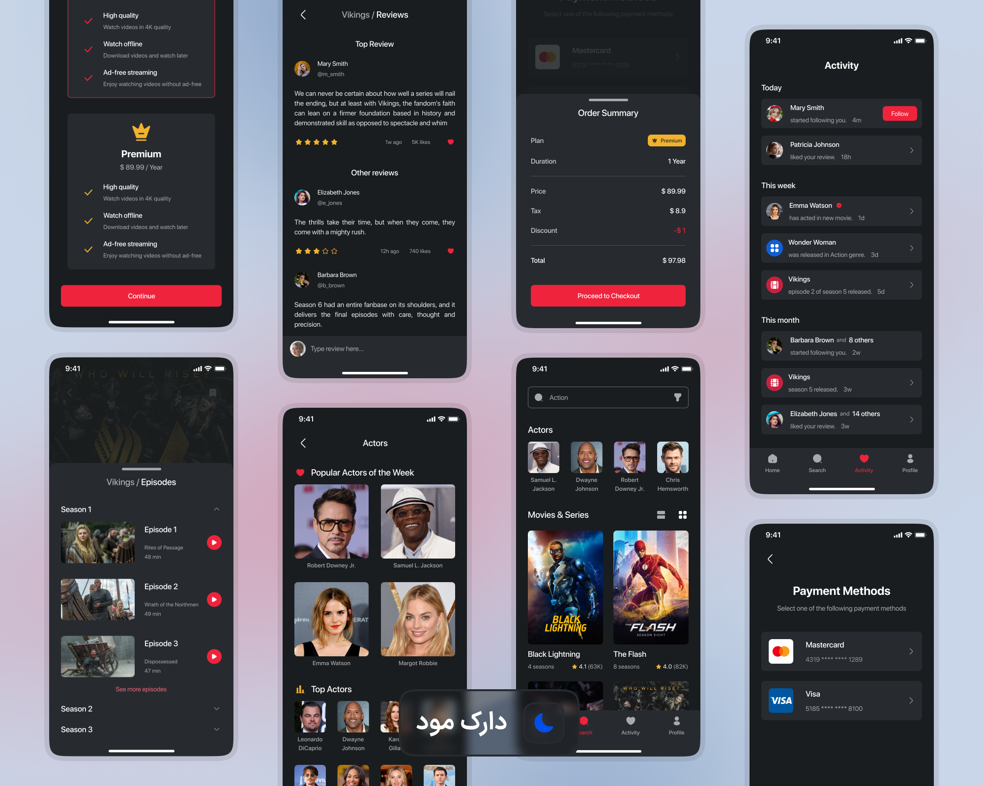 https://ui8.net/iahmadkarmola/products/movia-movies-streaming-app-ui-kitنکته: لینک بالا را با کامپیوتر/لپ تاپ باز کنید تا دکمه ی آبی رنگ Preview نمایش داده شود و با کلیک روی این دکمه، می توانید اسکرین شات های بیشتری از پروژه ی Movia را مشاهده کنید.